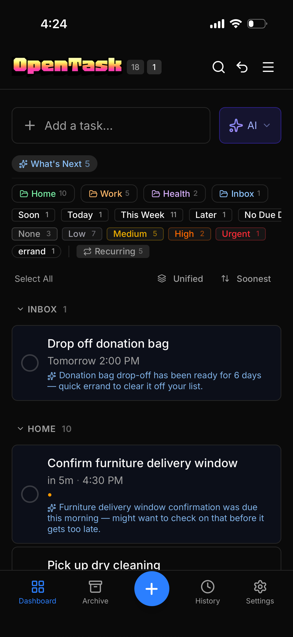 What's Next. AI recommendations that surface overlooked or forgotten tasks โ the ones that have been sitting quietly while you focus on what's urgent.
