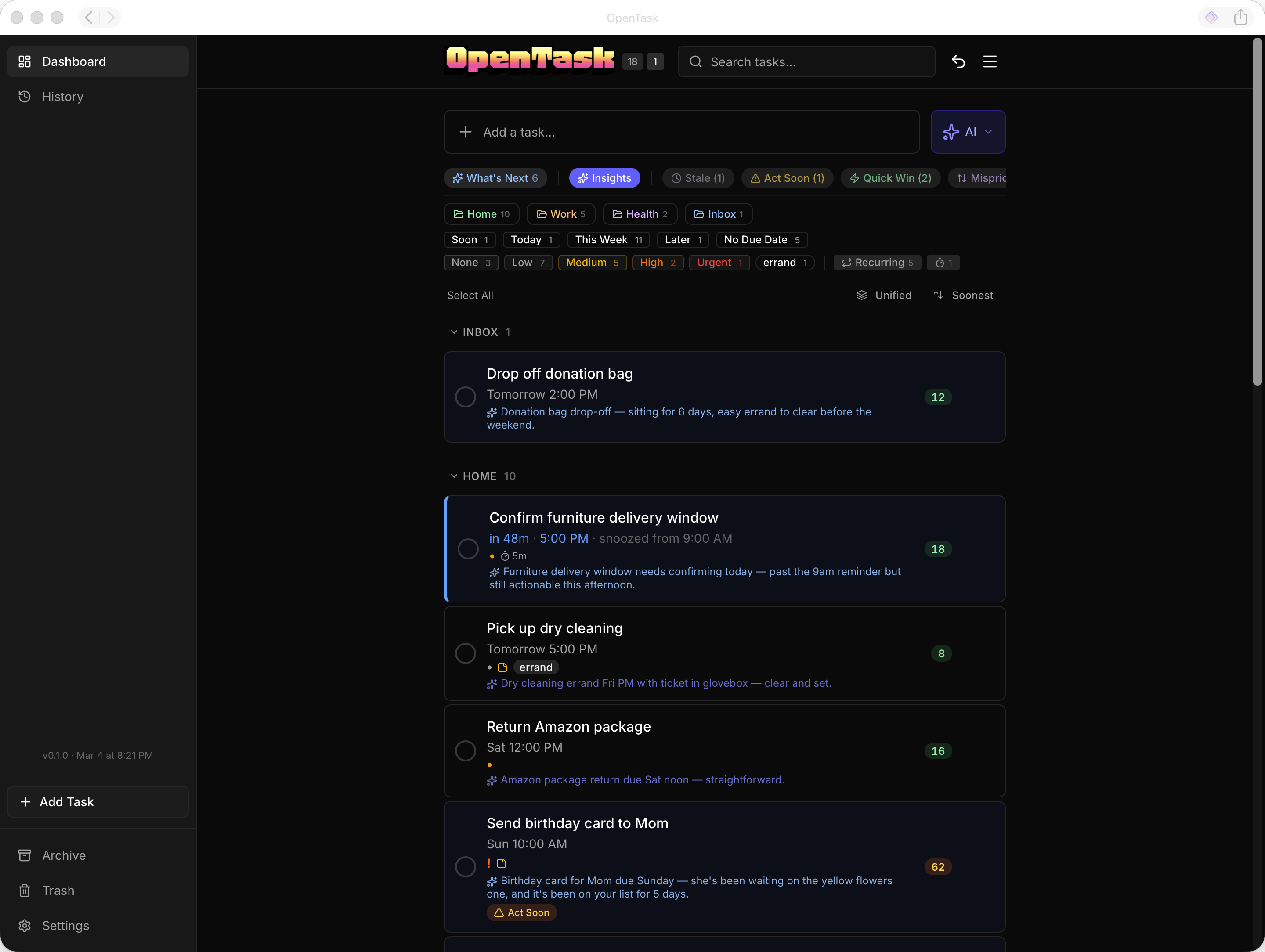 Each task gets an attention score so you can filter by Stale, Act Soon, Quick Win, or Misprioritized โ surfacing tasks like "Birthday card for Mom due Sunday โ she's been waiting on the yellow flowers one, and it's been on your list for 5 days."